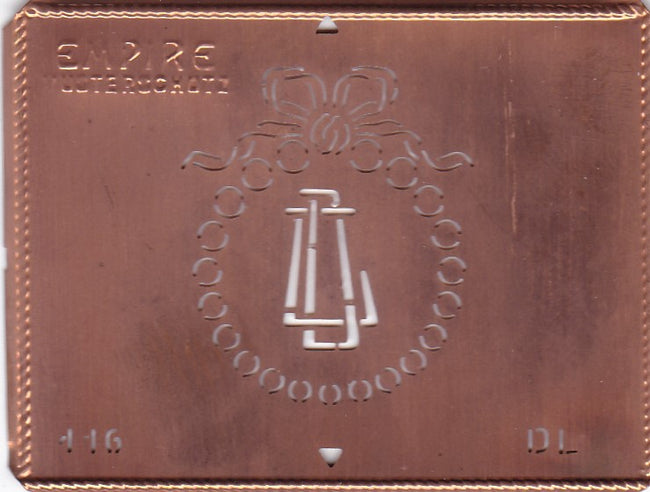 Das stilvolle Monogramm ist von einem sehr hübschen Kranz mit Schleife umgeben, der 3,3cm hoch und 2,7mm breit ist. In der linken oberen Ecke der Schablone befindet sich die Prägung EMPIRE - Musterschutz.